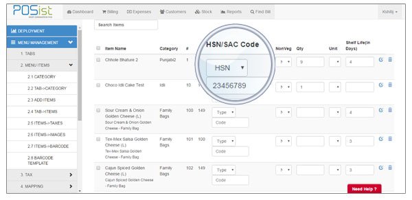 | The user needs to assign the codes to all the items first. In Administration -> Menu Management -> Menu Items -> Add Items, a new column in the name “HSN/SAC code” has been added. The user can select the type i.e. whether the item falls under HSN or SAC and can enter the code then against each item. The same also reflects in the bill at the time of billing. Also, CSV import has been updated to handle HSN/SAC code. |