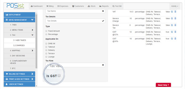 | After assigning the codes to all items, the user needs to create GST taxes. In Administration -> Menu Management -> Tax, a new check-box “Is GST”, has been added i.e., the user can now create GST taxes by checking on “Is GST” checkbox and it will get created successfully. |