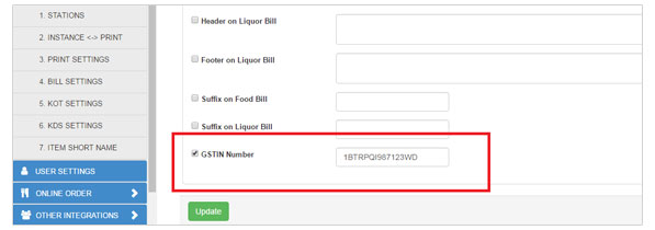 | Set the GSTIN No from the settings. In Administration -> Print and KDS Settings -> Bill Settings, , the user can add a unique GSTIN number in bill which is printed on the top of the bill. |